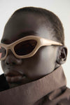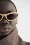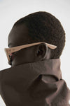 Hayya possesses serpentine qualities, piercing yet delicate, inspired by Arabic word for snake. This frame is designed with a focused gaze, its refined geometry balanced by a raised brow, a defined nose and a flattened bottom edge. Hayya features a cat-eye frame and is available in four distinct acetates and three lens colours.
